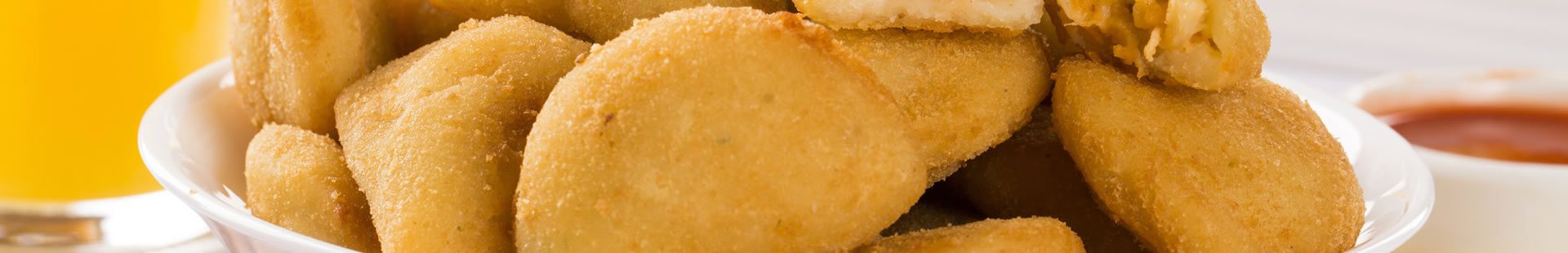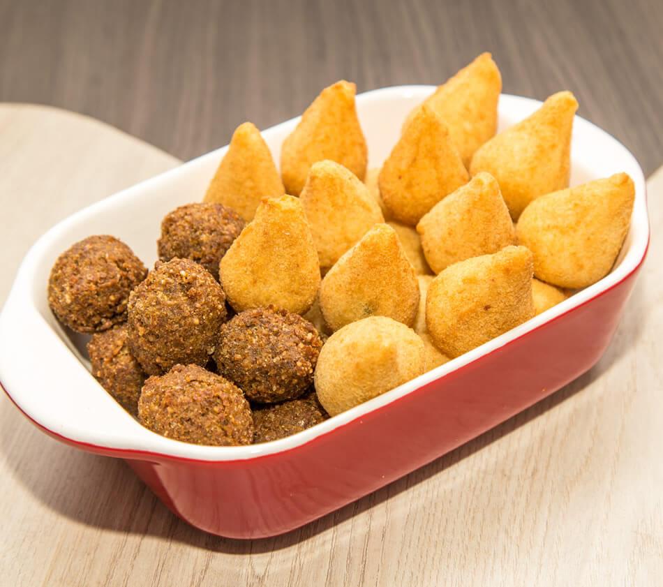 de salgados congelados e fritos, Nhoque recheado, Mini churros recheados e tradicionais.